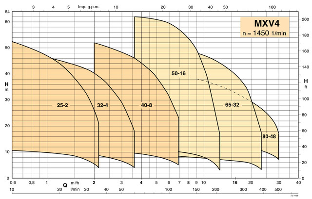 - Корпус насоса: хромонікелева нерж. сталь 1.4301 EN 10088 (AISI 304) для MVX 25-2/32-4/40/8 і чавун GJL 250 EN 1561 для MVX 50-16/65-32/80-48