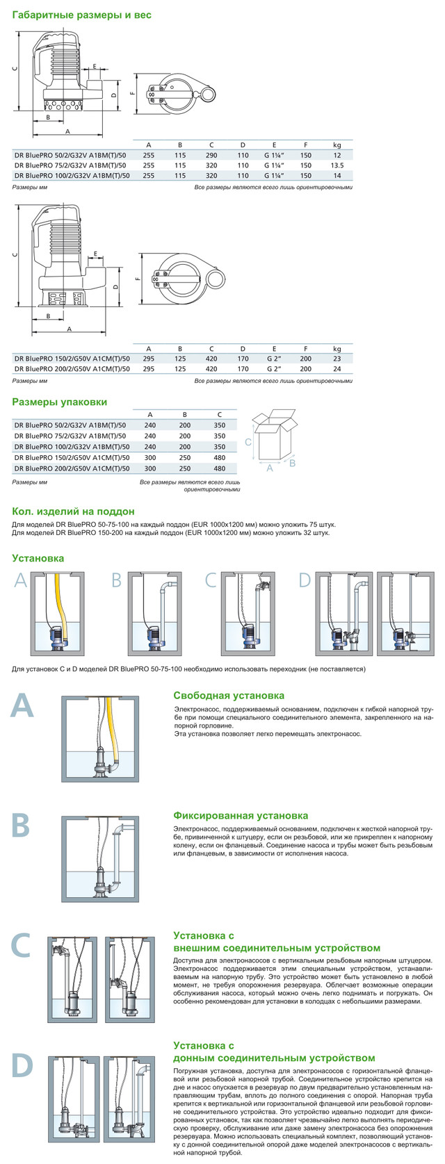 Всмоктувальна решітка та з'єднана пластина з неіржавкої сталі (моделі 50,75 і 100). Всмоктувальна решітка з поліпропілену зі з'єднаною пластиною й чавунною опорою (моделі 150 і 200).
