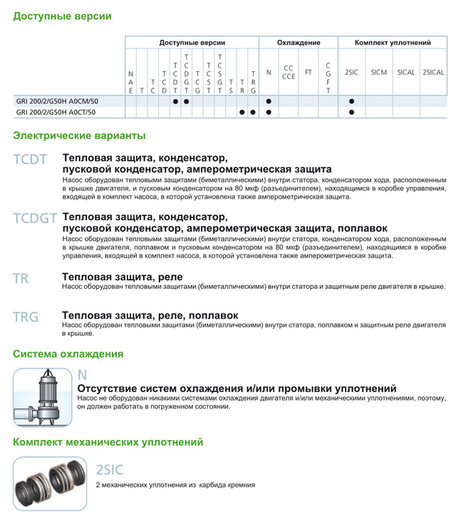 Однофазні моделі з внутрішнім конденсатором, коробка керування з роз'єднувальним конденсатором та ампераметричним захистом. Трифазні моделі, обладнані захисним реле двигуном.