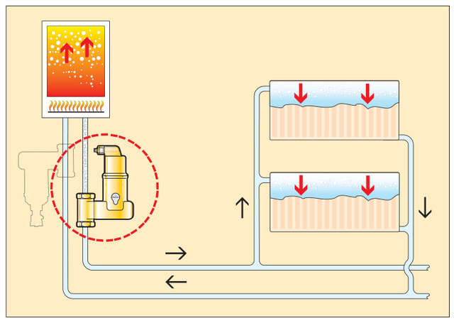 Віддавна всі надії на видалення повітря покладаються на "Старий-добрий" повітряовідводник. Але, на жаль, це найбільша помилка. Повітряна система може усунути лише великі об’єми повітря. По-суті, він працює в моменти заповнення системи, коли вода Вони витісняють значні об’єми повітря. Шум у системі опалення створюють мікропустурки повітря, які рухаються в потоці воды. Ці бульбашки не можуть бути видалені повітрям.